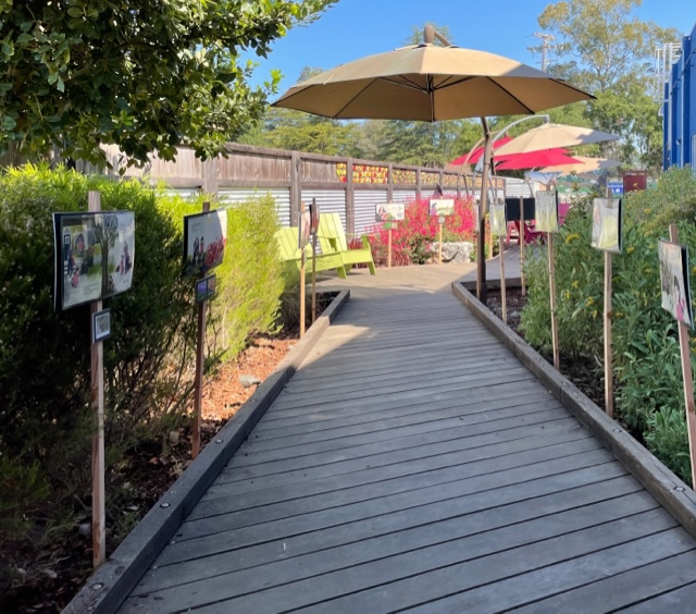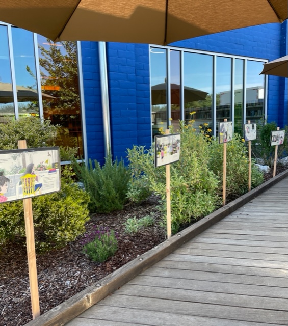 The Friends commissioned the Book Lover’s Mural to adorn the library’s back patio. The muralist, Bruce Harman, designed a magical scene showcasing the love of reading. It features a squirrel reading, flying books, a bookworm, and the perfect oak tree for shady reading.